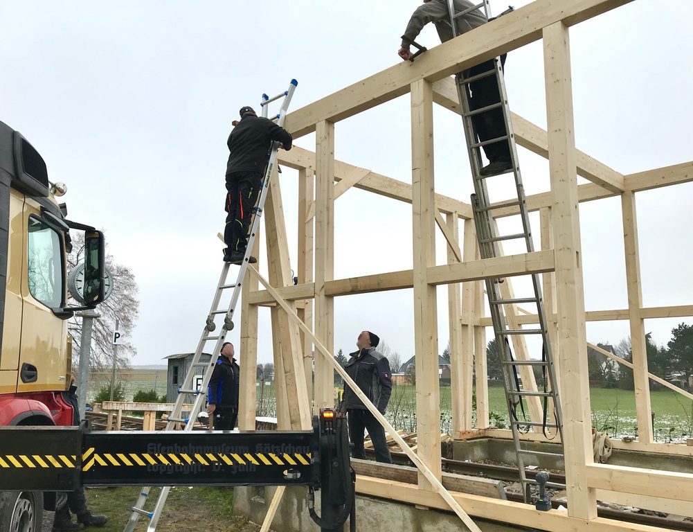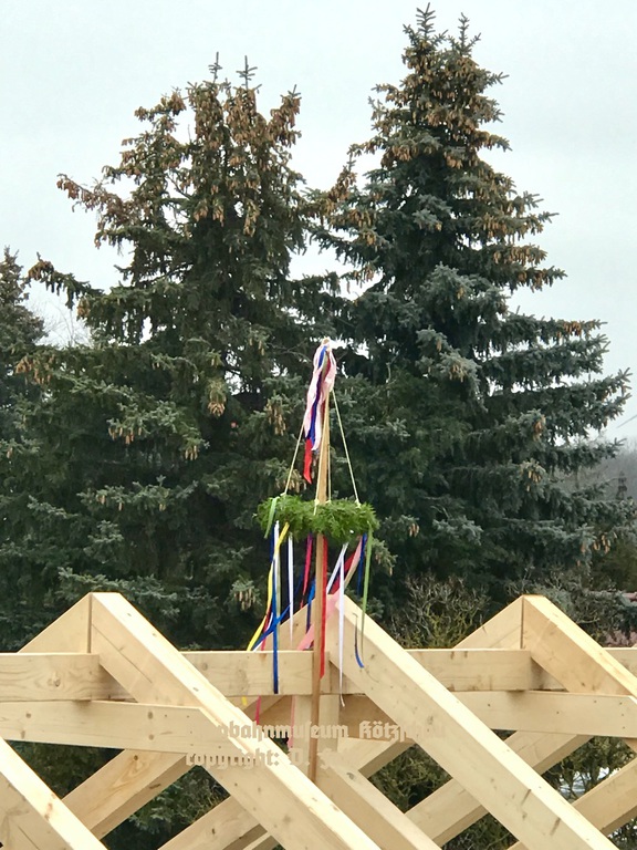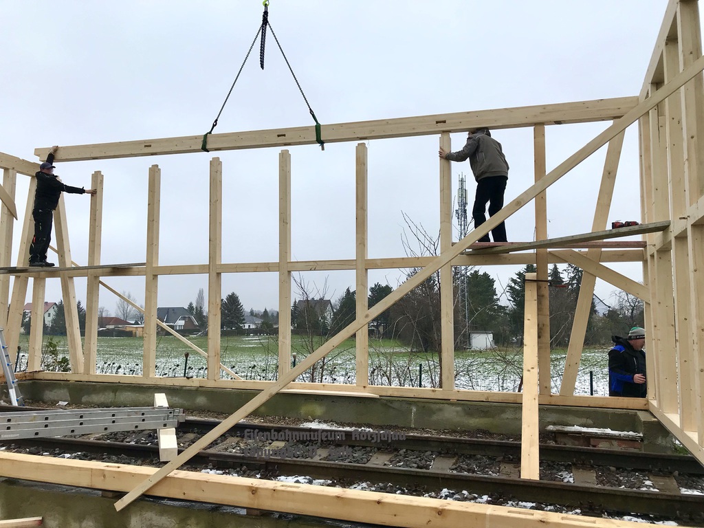 Januar: Aufbau und Fertigstellung Fachwerkkonstruktion, Richtfest am 27. Januar
