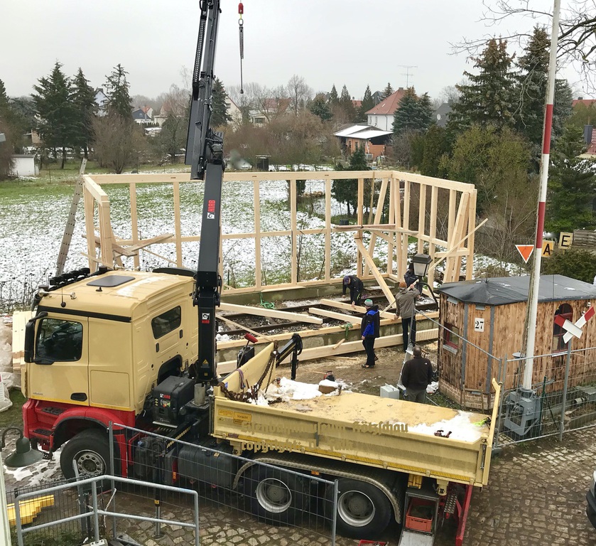 November: Fachwerkholz der Wände u. des Dachstuhls geleifert