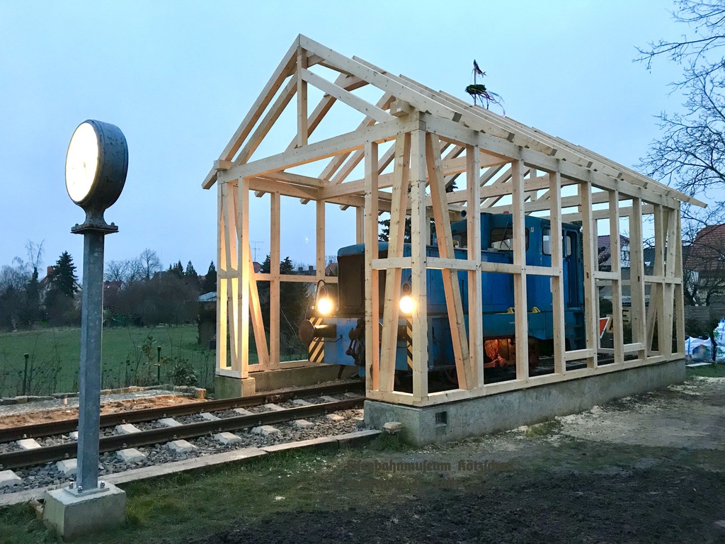 Damit die Diesellokomotive V22 zukünftig witterungsgeschützt untergestellt werden kann, wird ein Lokomotivschuppen errichtet. Das Gebäude, ein traditioneller Fachwerkbau, wird aber auch zukünftig den Draisinen des Museums eine Unterstellmöglichkeit bieten. Bei dem Bauwerk wurde weitestgehend darauf geachtet, das Gebäude wie jahrzehntelang vorhanden wirken zu lassen. Damit der Bau sich in das Ensemble des Museumsgeländes einfügt. Der Bau wird zunächst eine Grundfläche von 10,0 x 5,0 m haben. Da der Bau für den Betreiberverein einen großen finanziellen Kraftakt darstellt, sind wir selbstverständlich auf Spenden und Fördermittel angewiesen. Für die Finanzierung konnten u.a. Fördergelder der Nahverkehrsservice Sachsen-Anhalt GmbH (NASA) aus dem Programm "Technische Denkmäler" sowie einige zweckgebundene Spenden verwendet werden. Siehe Liste mit Spendern unten. Die Bauarbeiten werden von den Vereinsmitgliedern weitestgehend in Eigenleistung ausgeführt.